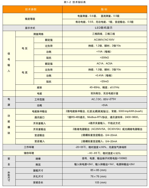 多功能電力監(jiān)測(cè)儀表是一種具有可編程測(cè)量,綜合顯示三相電參量、電能計(jì)量、數(shù)字通訊功能于一體的智能化儀表。能夠完成電量測(cè)量、電能計(jì)量、數(shù)據(jù)顯示、采集及傳輸,可廣泛應(yīng)用于變電站自動(dòng)化、配電自動(dòng)化、智能建筑、企業(yè)內(nèi)部電能計(jì)量、管理、考核。測(cè)量精度為0.5S級(jí),實(shí)現(xiàn)現(xiàn)場(chǎng)顯示和遠(yuǎn)程RS-485數(shù)字接口通訊、采用Modbus-RTU通訊協(xié)議。